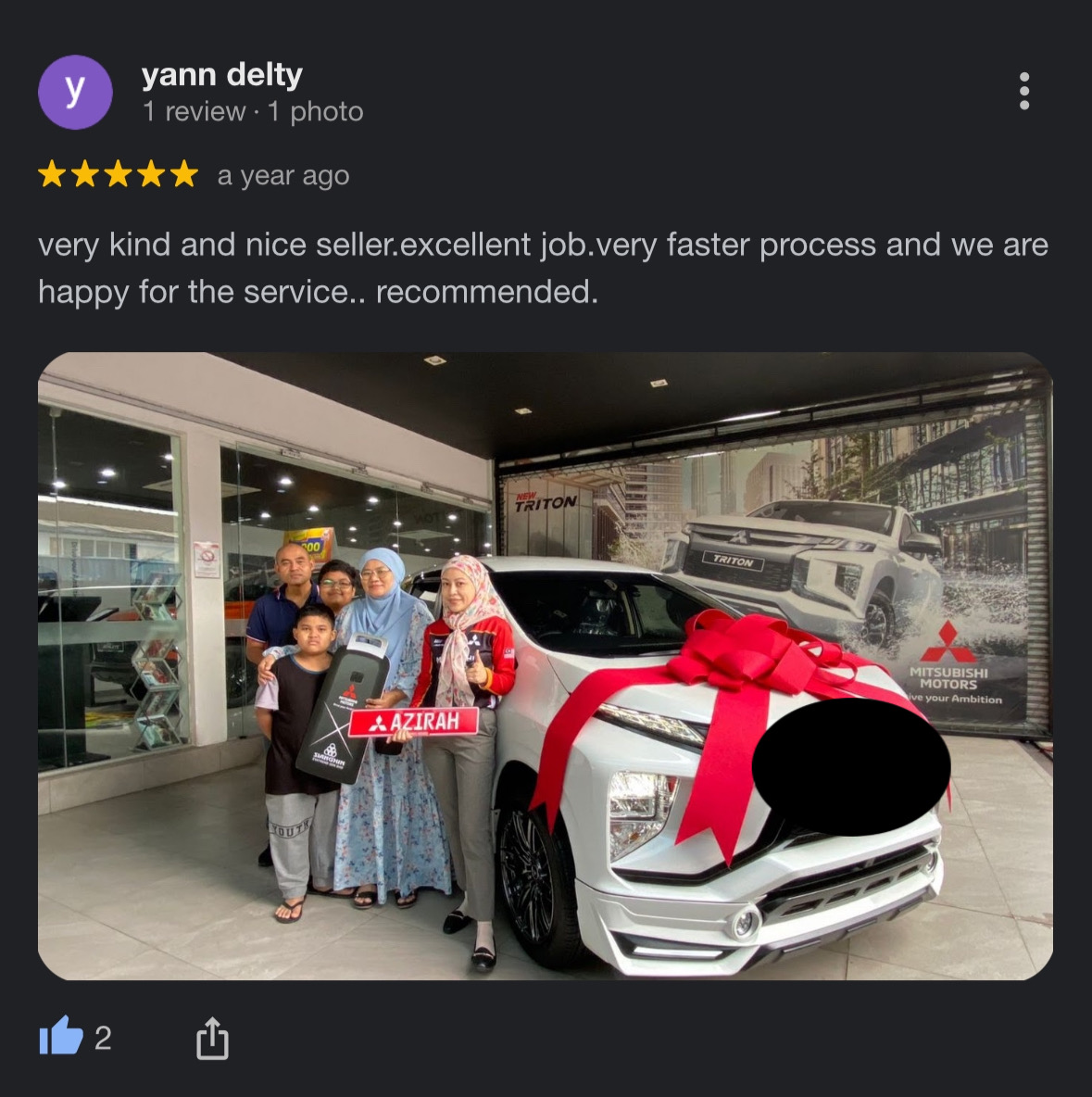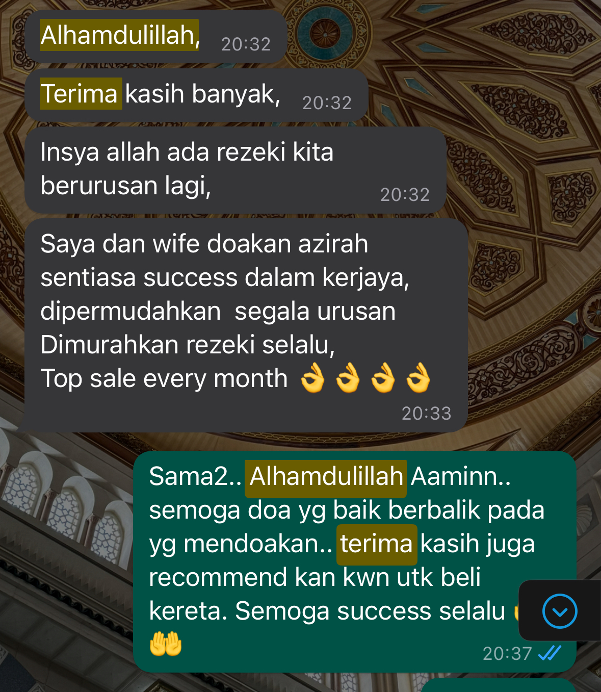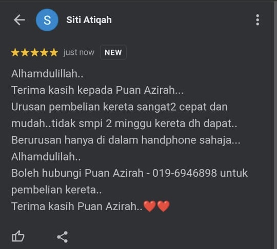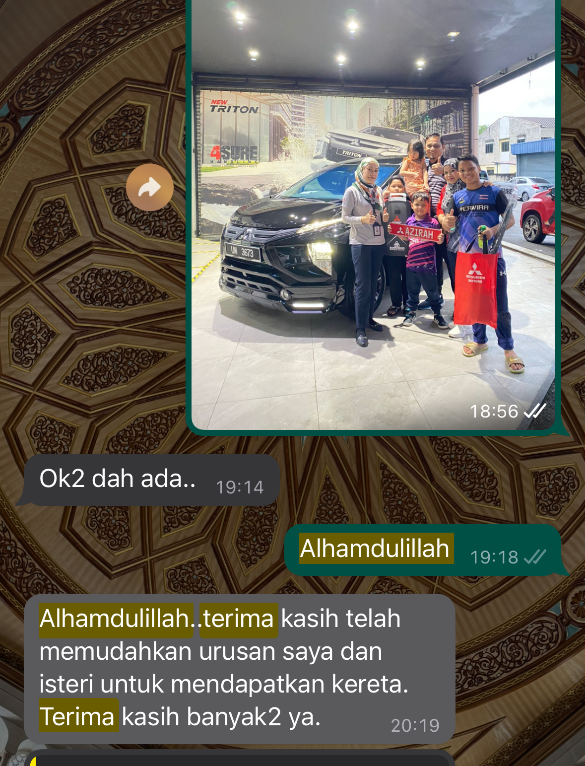 Sehingga kini, saya telah berjaya membantu ribuan pelanggan untuk memiliki kereta baru. Seluruh proses pemilihan, pinjaman dan penyerahan kereta akan dibantu sepenuhnya oleh saya!
