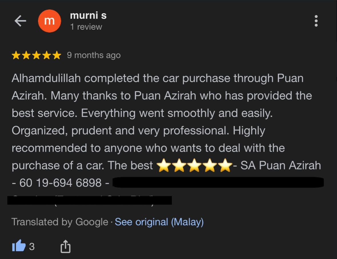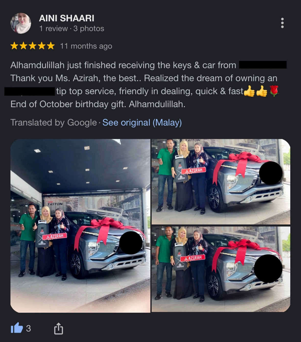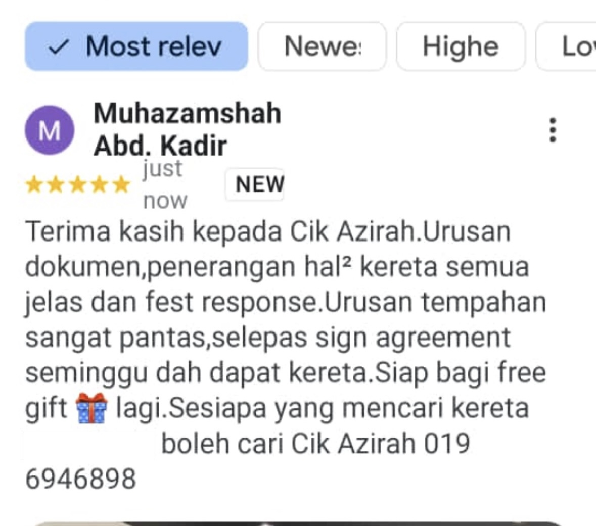 Sehingga kini, saya telah berjaya membantu ribuan pelanggan untuk memiliki kereta baru. Seluruh proses pemilihan, pinjaman dan penyerahan kereta akan dibantu sepenuhnya oleh saya!