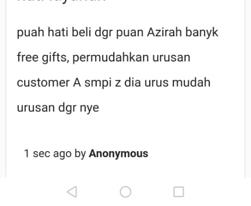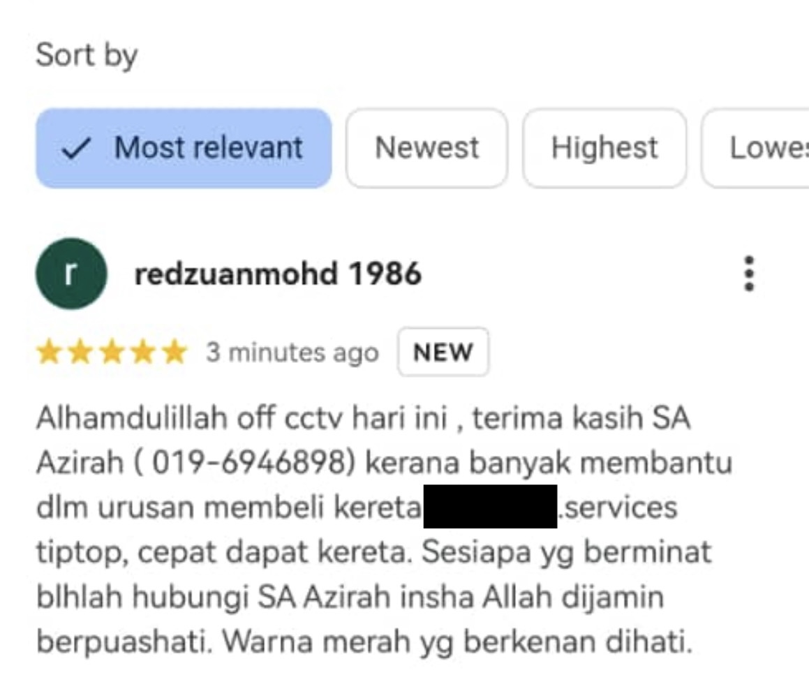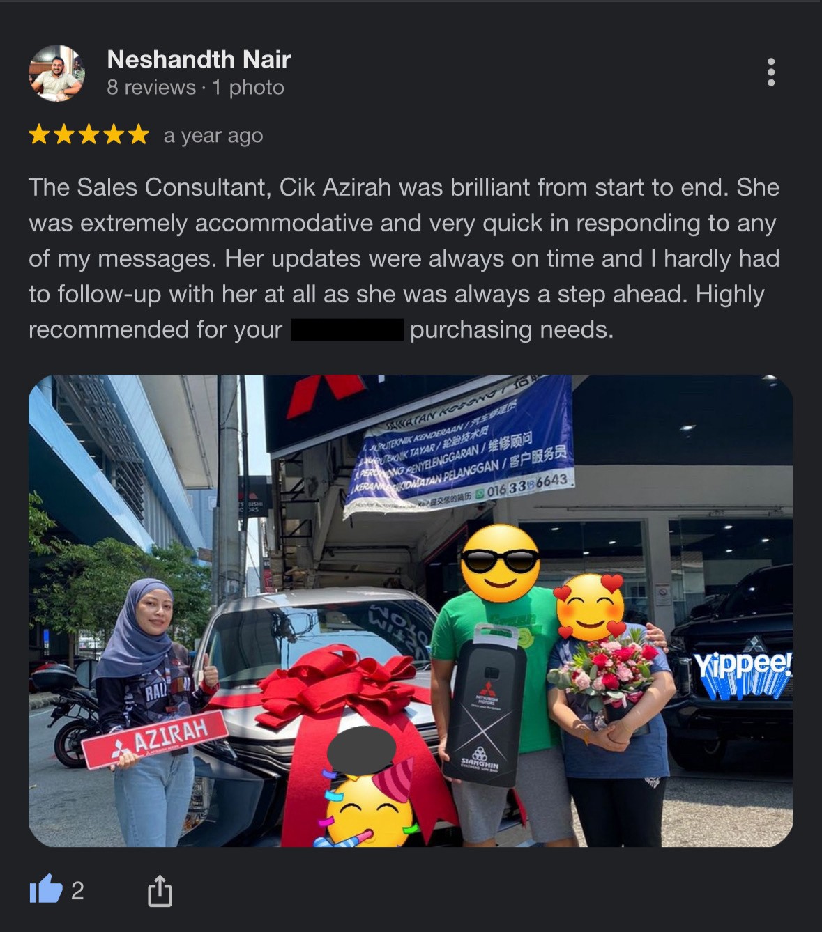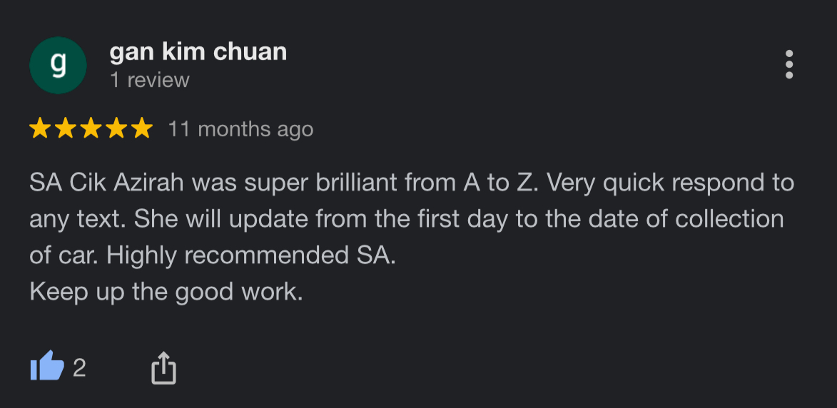 Hai! Nama saya Azirah, Sales Consultant Ford yang sah. Berpengalaman lebih 5 tahun dalam bidang jualan kereta di Malaysia.